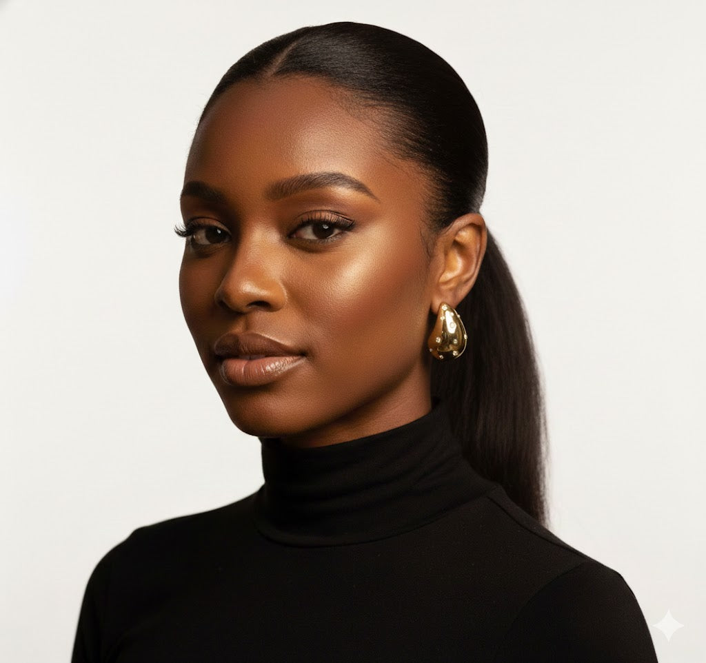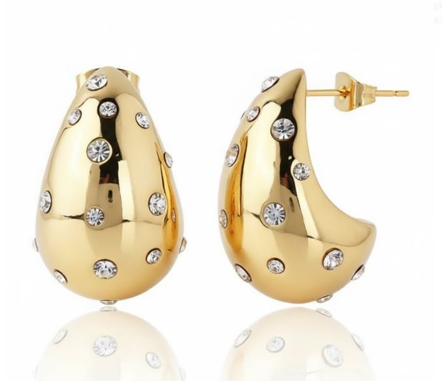 To preserve the brilliance of your earrings, store them in a soft pouch or jewelry box away from moisture and direct sunlight. Clean gently with a soft, lint-free cloth to maintain the sparkle of the rhinestones and protect the gold metal from tarnishing. Avoid exposure to perfumes, lotions, and harsh chemicals, which can dull both the metal and stone settings. Remove before swimming or showering to prevent water damage. With proper care, these elegant pieces will retain their lustrous beauty for years to come.