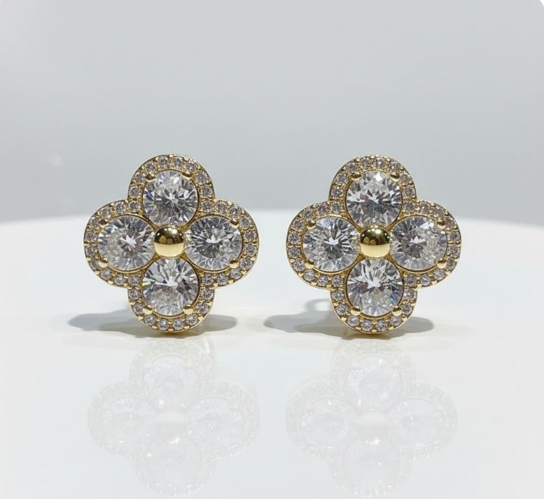These exquisite vintage quatrefoil earrings showcase lustrous gold-tone settings adorned with sparkling diamante stones that capture light with remarkable brilliance. Each piece exemplifies timeless elegance, featuring the iconic four-lobed quatrefoil motif that has graced high-fashion collections for decades.