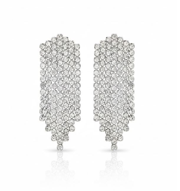 These sophisticated 7-layer diamante earrings showcase cascading brilliance with meticulously arranged rhinestones that catch and reflect light from every angle. Crafted in lustrous silver, the dangling design creates graceful movement and dimension, making them an ideal choice for evening events or elevated casual occasions.